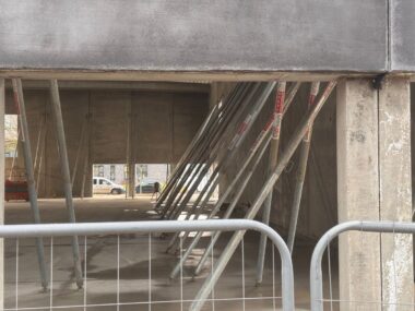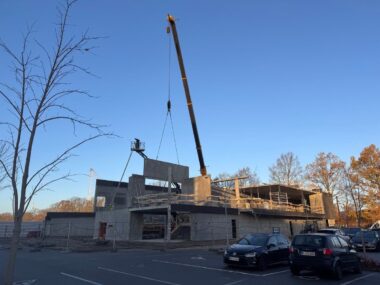 Et kig ind i NEXT’s nye multihal, der netop har haft rejsegilde – og snart kan væggene stå selv. Når den er færdig, får bydelen også glæde af hallen, som kan bruges af andre udenfor skolens åbningstid.